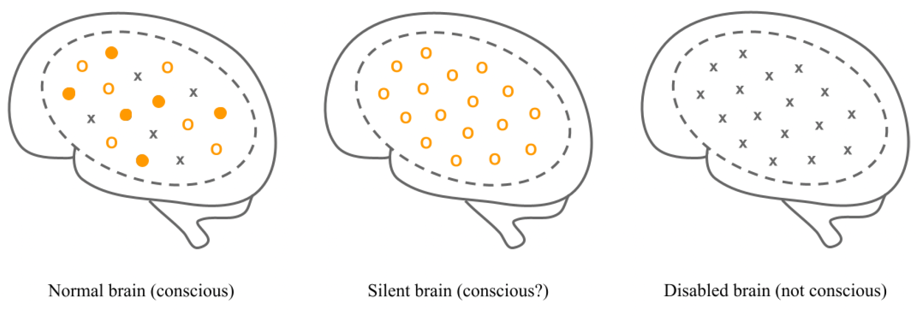 Figure 2. Solid orange circles represent spiking neurons, open orange circles represent silent neurons, and gray x’s represent disabled neurons. (Left) A typical brain state in which some neurons in the main complex are spiking, some neurons are not spiking and cannot fire (e.g., due to hyperpolarization), and some neurons are not spiking but could still fire (are merely silent), for example, if they were to receive sufficient synaptic input. (Middle) In the context of the silent brain prediction, all neurons in the main complex are silenced, and although there is no spiking activity, there would still be experience, because the neurons are still able to fire. (Right) By contrast, if all neurons in the main complex were disabled, consciousness would be absent.