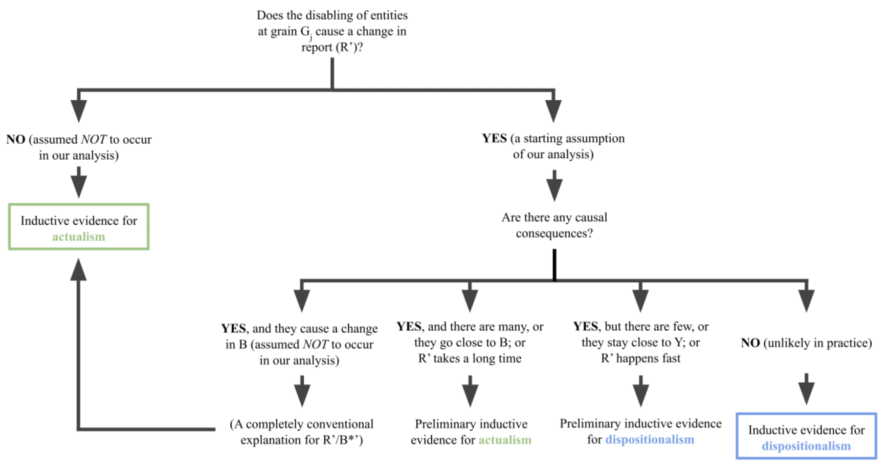 Figure 7. A flowchart of the testing framework for the disabled neuron prediction and how different evidence supports actualism vs. dispositionalism.